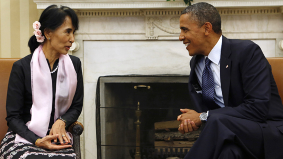 U.S. President Obama speaks with Myanmar opposition leader Suu Kyi during their meeting in the White House. (Photo: Kevin Lamarque/REUTERS)