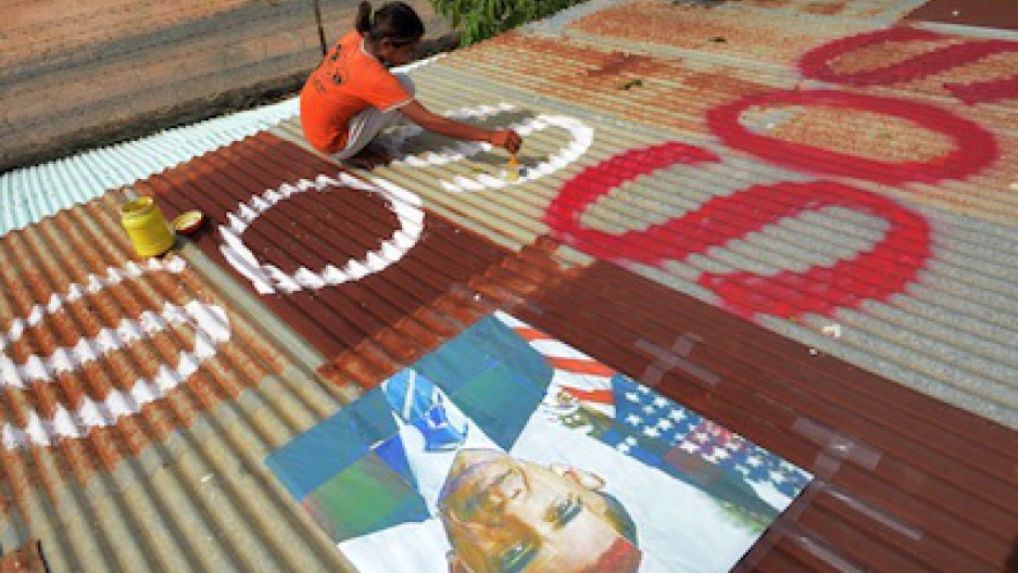 But it just so happens that one slum village slated for demolition is situated in the path of incoming flights to the capital Phnom Penh's airport. So, as the Associated Press reports, they painted SOS on their tin roofs alongside photos of Obama. Perhaps they thought he'd awkwardly ask, "What's the deal with that SOS village?" when drinking tea with Hun Sen, Cambodia's strongman premier.