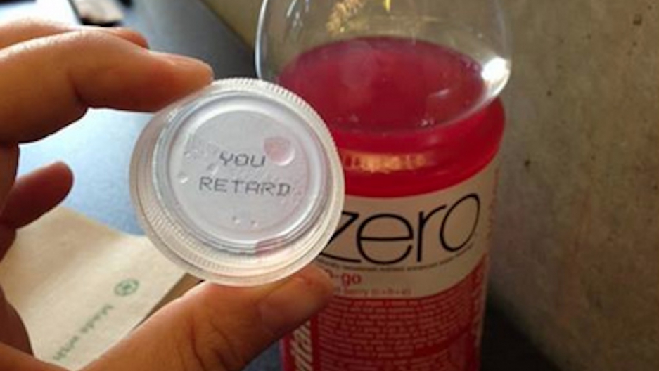 Blake Loates was shocked when she found the offensive words printed inside the cap of a Vitamin Water bottle while at dinner with her husband on Tuesday night.