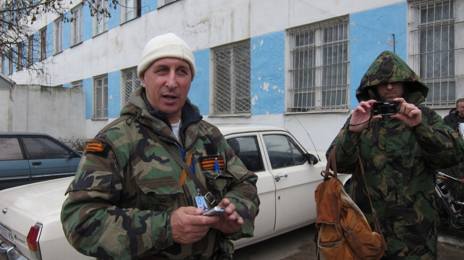 There, a long line of men guards the entrance to the Ukrainian naval headquarters. Dressed in civilian clothes, the men wave Russian flags and ask me for ID as I approach. I explain that I have a meeting with one of the Ukrainian commanders, Vladislav Litovchenko.